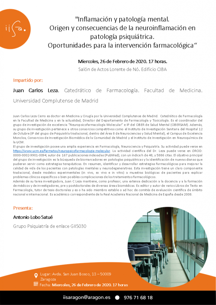 El próximo miércoles, 26 de Febrero de 2020. A las 17:00 horas tendrá lugar el Seminario Biomédico «Inflamación y patología mental. Origen y consecuencias de la neuroinflamación en patología psiquiátrica. Oportunidades para la intervención farmacológica», impartido por el Dr. Juan Carlos Leza.