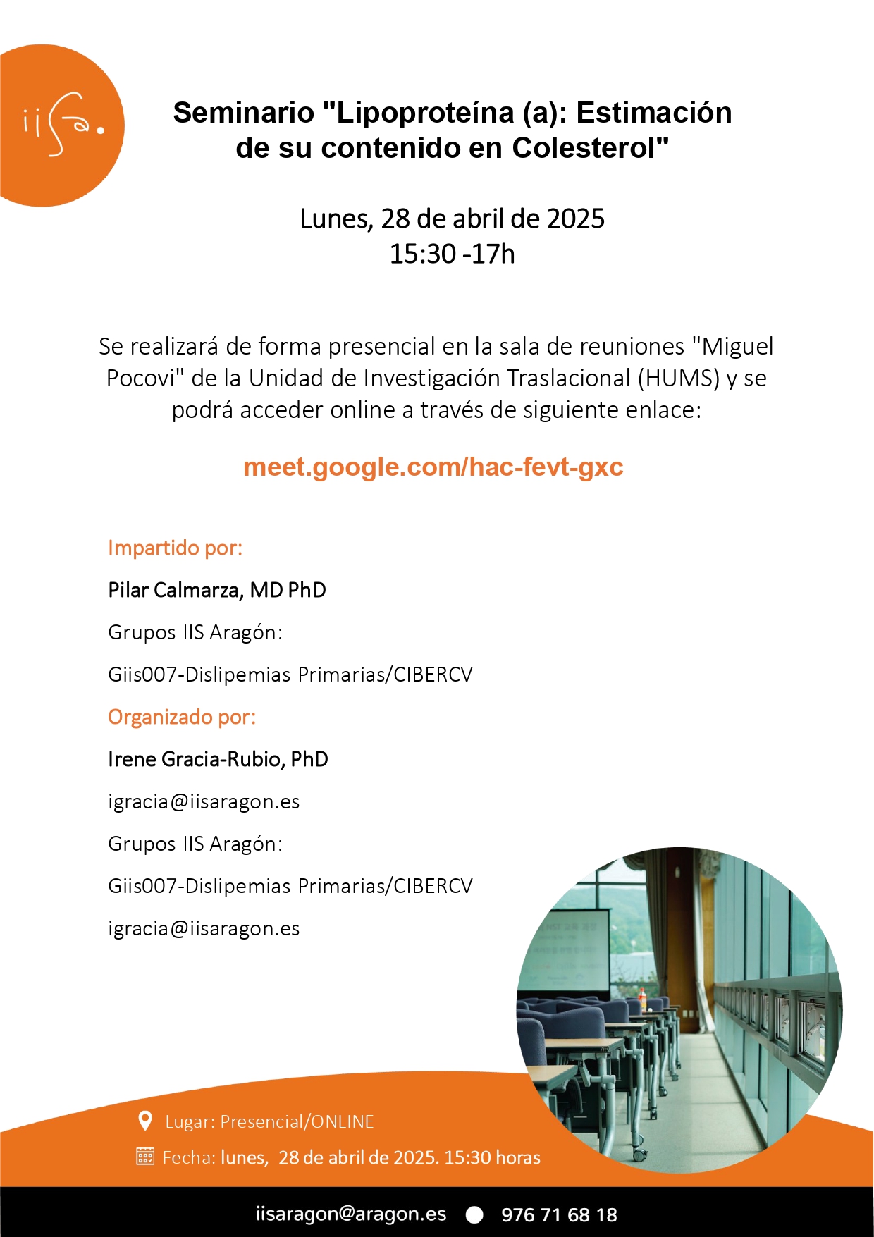 El Instituto de Investigación Sanitaria Aragón, en colaboración con el Grupo GIIS007 Dislipemias Primarias/CIBERCV, organiza el Seminario Científico: “Lipoproteína (a): Estimación de su contenido en colesterol, que tendrá lugar el lunes 28 de abril de 2025 a las 15:30h. (!) Debido a circunstencias ajenas al IIS Aragón, el seminario se celebrará el 05 de mayo de 2025.