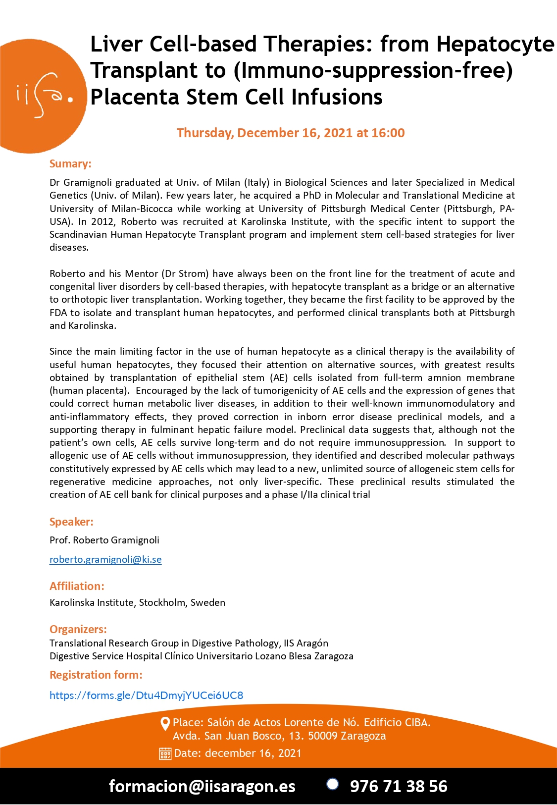 Seminario Científico “Liver Cell-based Therapies: from Hepatocyte Transplant to (Immuno-suppression-free) Placenta Stem Cell Infusions”