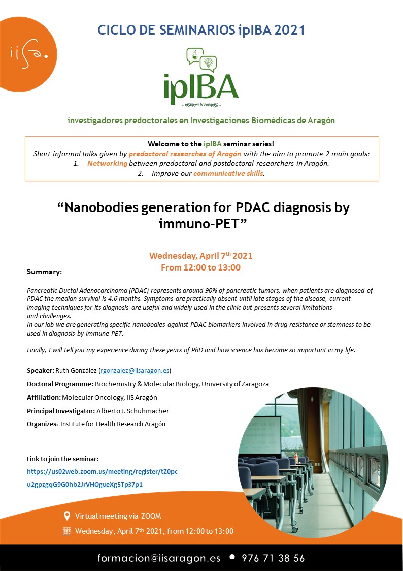 El próximo Miércoles, 7 de Abril de 2021 de 12:00 a 13:00 horas tendrá lugar el Seminario Científico «Nanobodies generation for PDAC diagnosis by immuno-PET«.