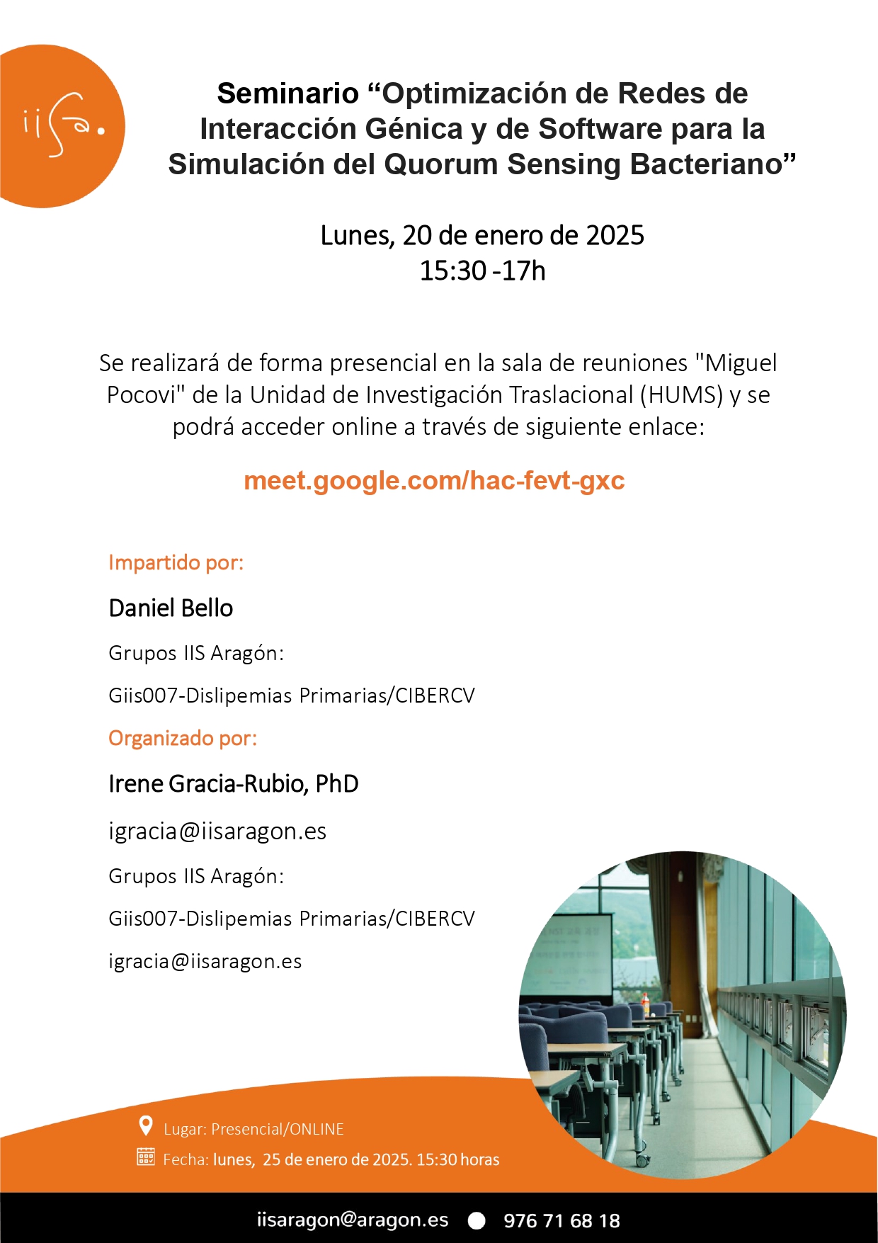 El Instituto de Investigación Sanitaria Aragón en colaboración con el Grupo GIIS 007-Dislipemias Primarias/CIBERCV organizan el Seminario Científico: “Optimización de redes de interacción génica y de software para la simulación del quorum sensing bacteriano, que tendrá lugar el lunes 20 de enero de 2025 a las 15:30h.