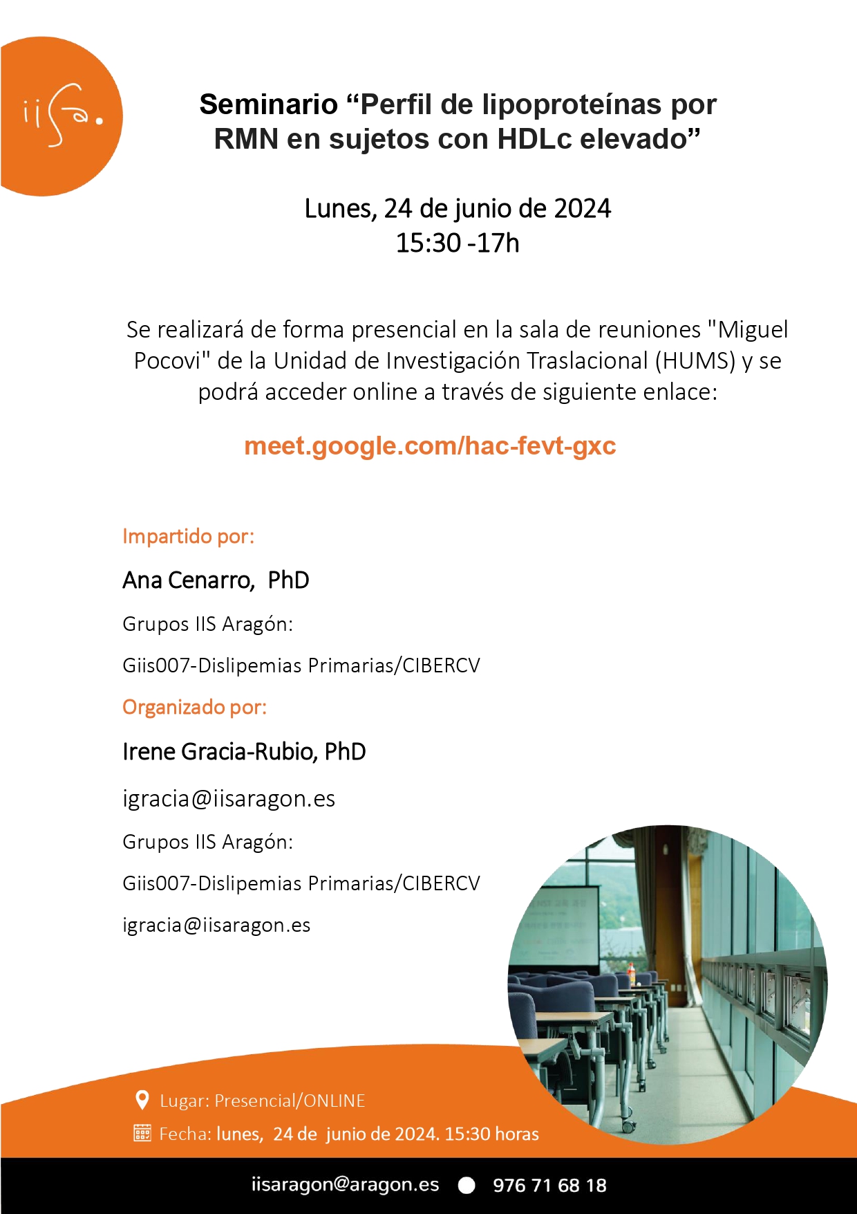 El Instituto de Investigación Sanitaria Aragón en colaboración con el Grupo GIIS 007-Dislipemias Primarias/CIBERCV organizan el Seminario Científico: “Perfil de lipoproteínas por RMN en sujetos con HDLc elevado, que tendrá lugar el lunes 24 de junio de 2024 a las 15:30h.