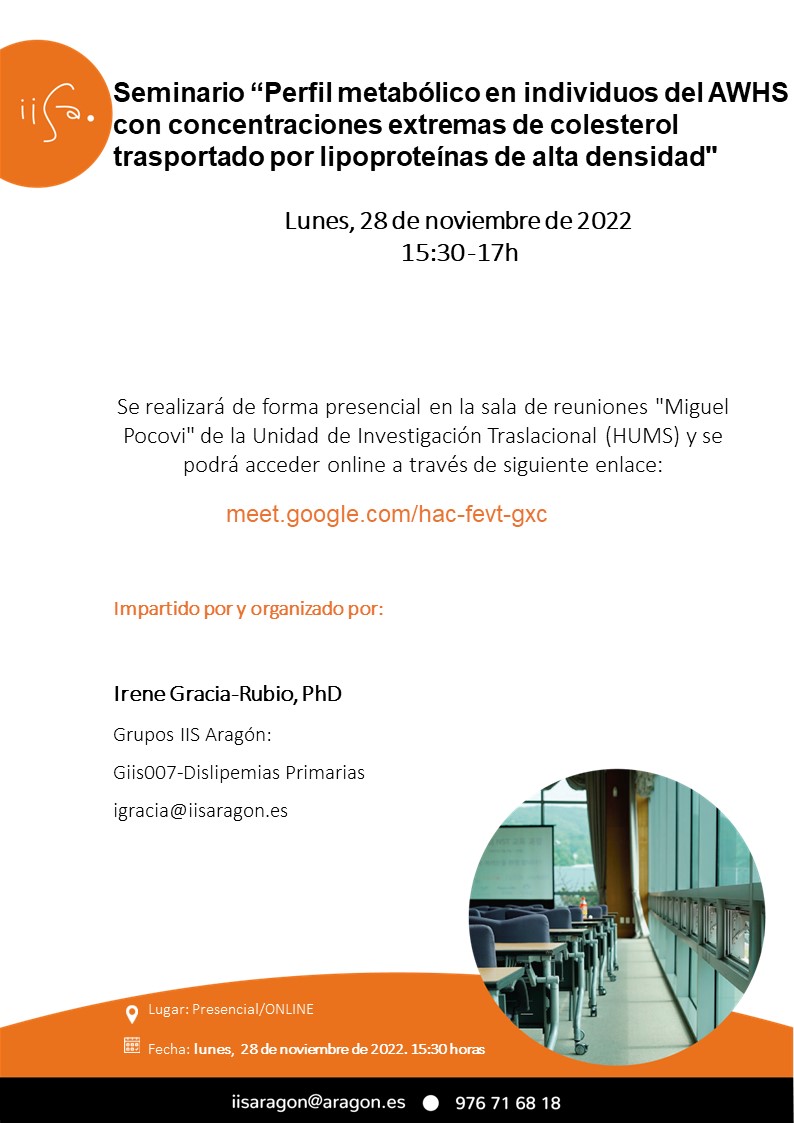 El próximo Lunes, 28 de noviembre de 2022 a las 15:30 h tendrá lugar el Seminario Científico “Perfil metabólico en individuos del AWHS con concentraciones extremas de colesterol trasportado por lipoproteínas de alta densidad»