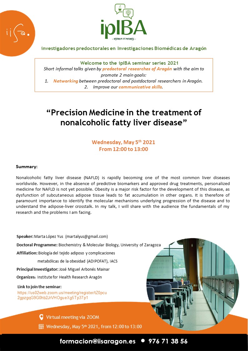 El próximo Miércoles, 5 de mayo de 2021 de 12:00 a 13:00 horas tendrá lugar el Seminario Científico “Precision Medicine in the treatment of nonalcoholic fatty liver disease”.