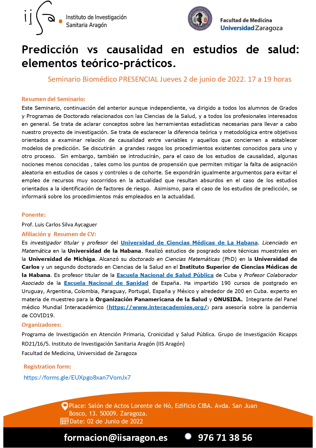 El próximo Jueves 2 de Junio de 2022 de 17:00 a 19:00 horas tendrá lugar el Seminario Científico “Predicción vs causalidad en estudios de salud: elementos teórico-prácticos”