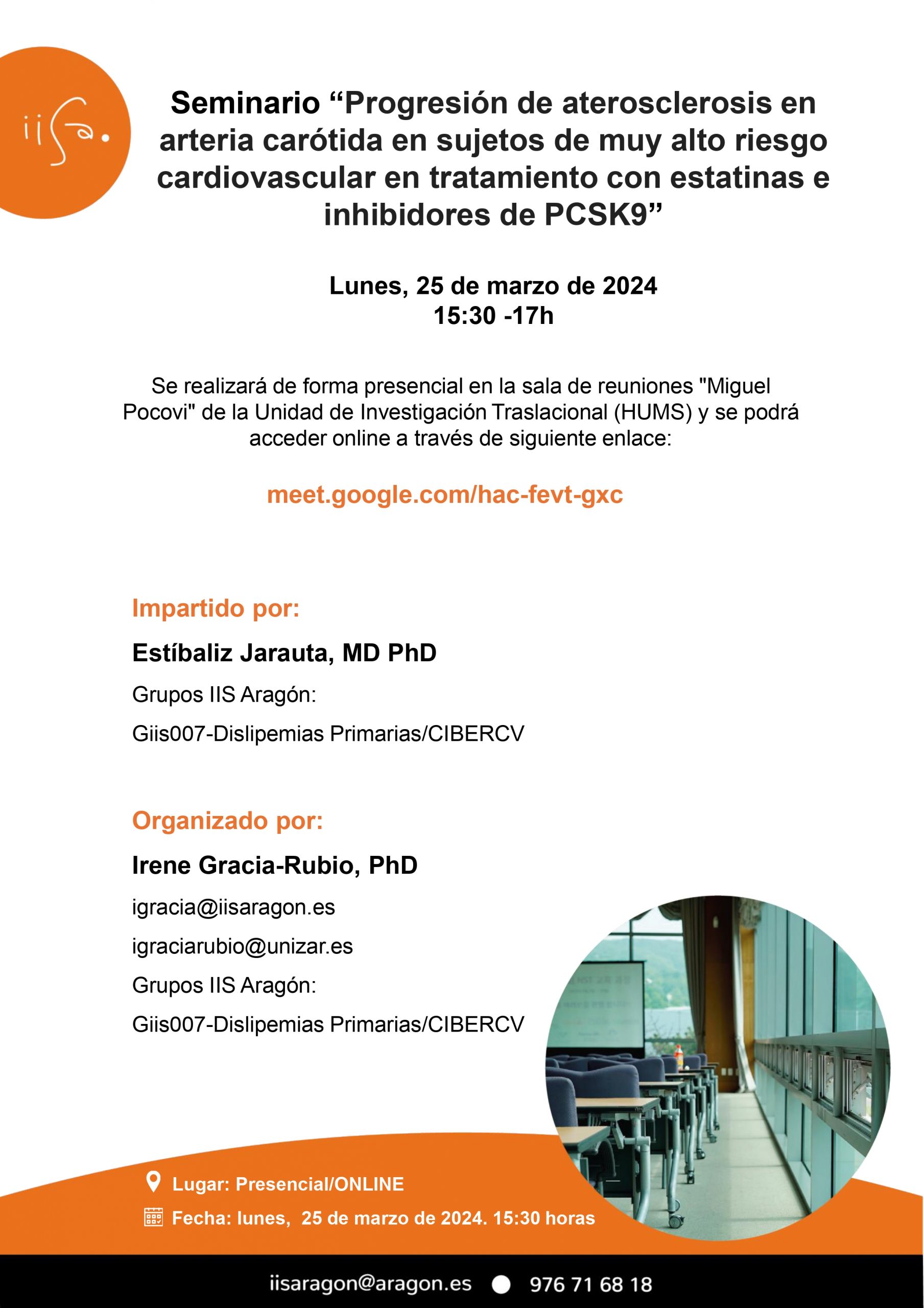 El Instituto de Investigación Sanitaria Aragón en colaboración con el Grupo GIIS 007-Dislipemias Primarias/CIBERCV organizan el Seminario Científico: “Progresión de aterosclerosis en arteria carótida en sujetos de muy alto riesgo cardiovascular en tratamiento con estatinas e inhibidores de PCSK9” el lunes 25 de marzo de 2024 a las 15:30h.