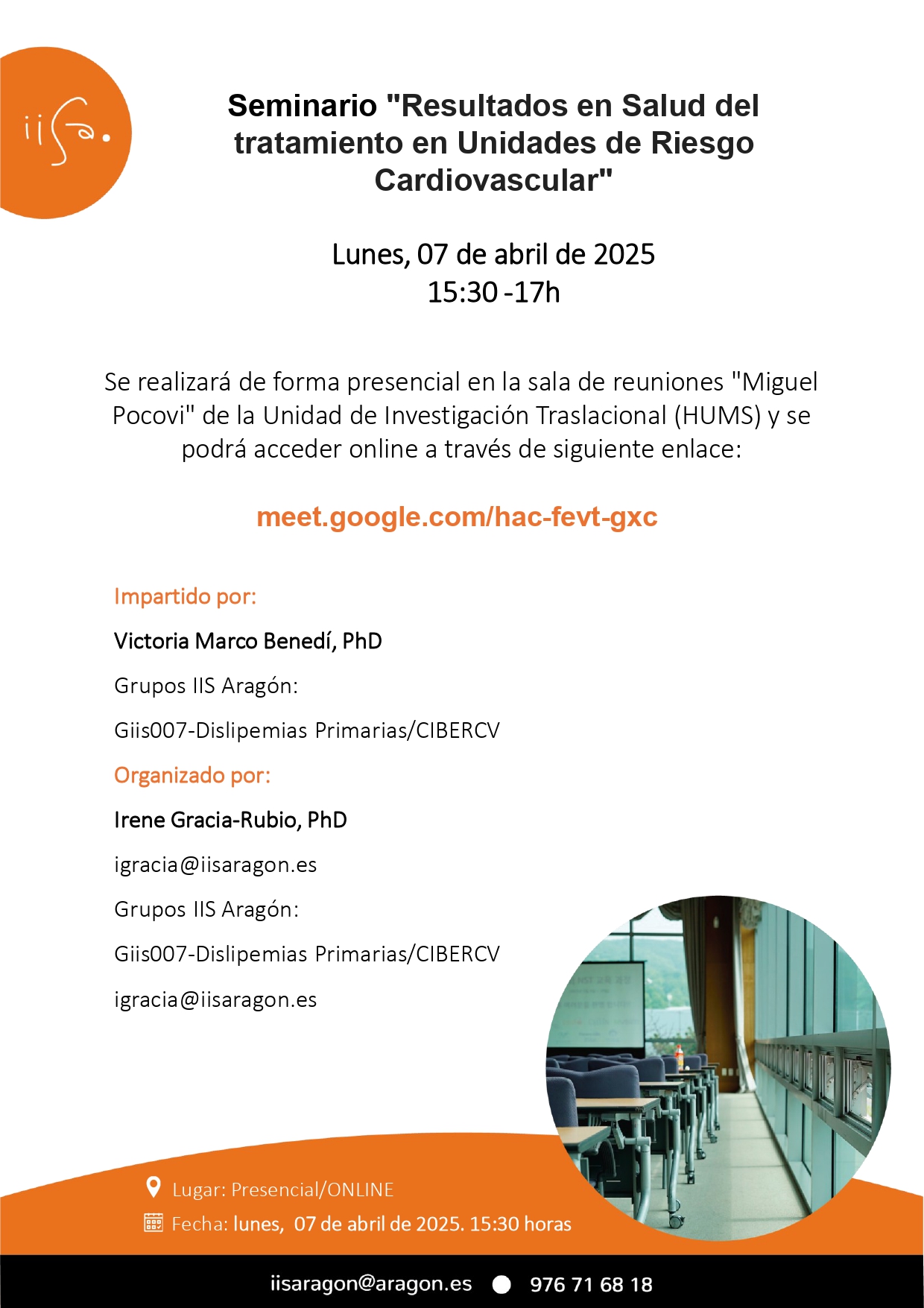 El Instituto de Investigación Sanitaria Aragón, en colaboración con el Grupo GIIS007 Dislipemias Primarias/CIBERCV, organiza el Seminario Científico: “Resultados en Salud del tratamiento en Unidades de Riesgo Cardiovascular, que tendrá lugar el lunes 07 de abril de 2025 a las 15:30h.