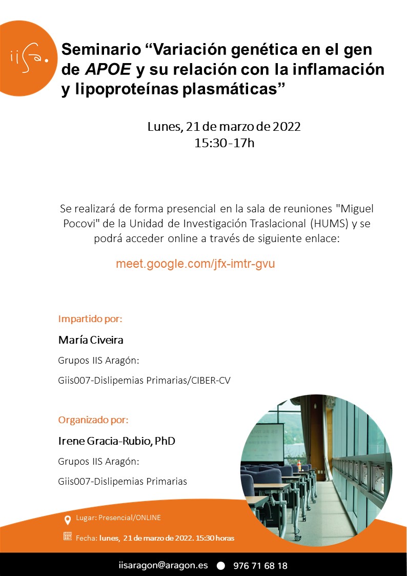 El próximo Lunes 21 de Marzo de 2022 a las 15:30 horas tendrá lugar el Seminario Científico “Variación genética en el gen de APOE y su relación con la inflamación y lipoproteínas plasmáticas”
