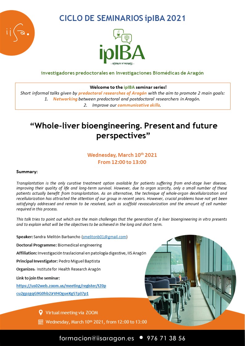 El próximo Miércoles, 10 de Marzo de 2021 de 12:00 a 13:00 horas tendrá lugar el Seminario Científico «Whole-liver bioengineering. Present and future perspectives«.