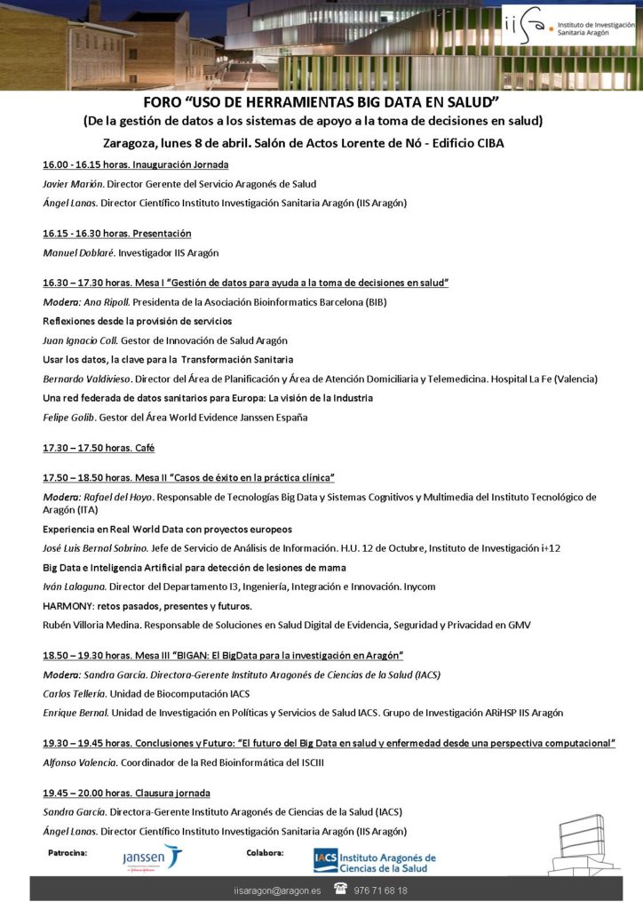 9 abril, 2019El Instituto de Investigación Sanitaria Aragón (IIS Aragón) en colaboración con el Instituto Aragonés de Ciencias de la Salud (IACS) y Janssen organizan el Foro “Uso de Herramientas Big Data en Salud”, que tendrá lugar en el Salón de Actos Lorente de Nó del Edificio CIBA el lunes, 8 de abril de 2019 en horario de 16.00 a 20.00 horas.