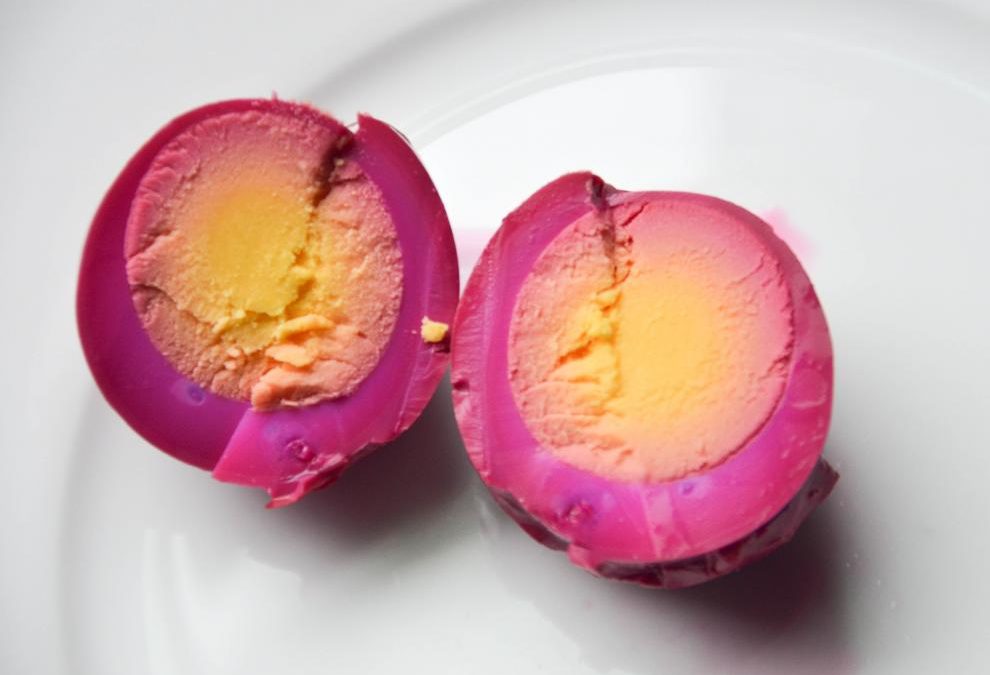 Lo que hace (o debería hacer) realmente especiales a los huevos marinados/encurtidos a ojos de los profesores de ciencia es que su blanca clara constituye un perfecto lienzo para observar y enseñar cómo funciona la difusión y su dependencia con el tiempo y la temperatura. Más aún si lo que se emplea para marinar es un líquido oscuro como la salsa de soja, el vinagre de vino tinto, el aceto balsámico o, mejor aún, la colorista y colorante remolacha.