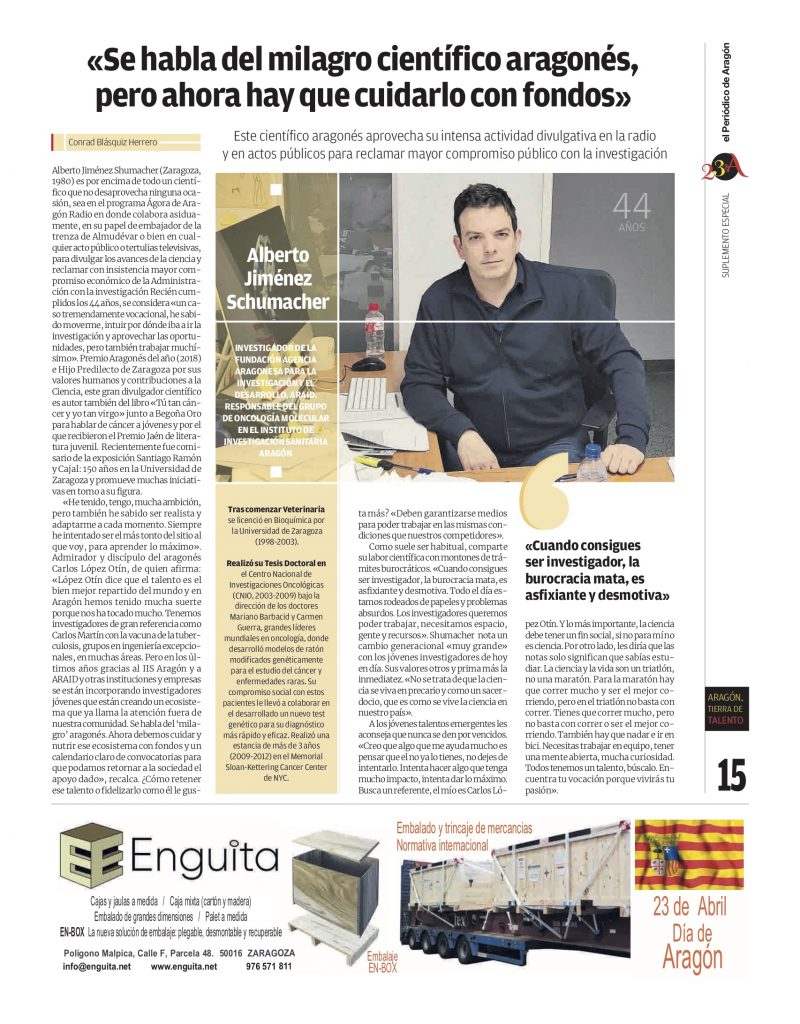 30 abril, 2024El Periódico de Aragón también ha seleccionado el perfil de Alberto Jiménez Schuhmacher, investigador ARAID y responsable del Grupo de Oncología Molecular del IIS Aragón, para su suplemento especial de talento en nuestra Comunidad. Una completa entrevista para conocer de cerca a este referente de la investigación y cómo es su día a día