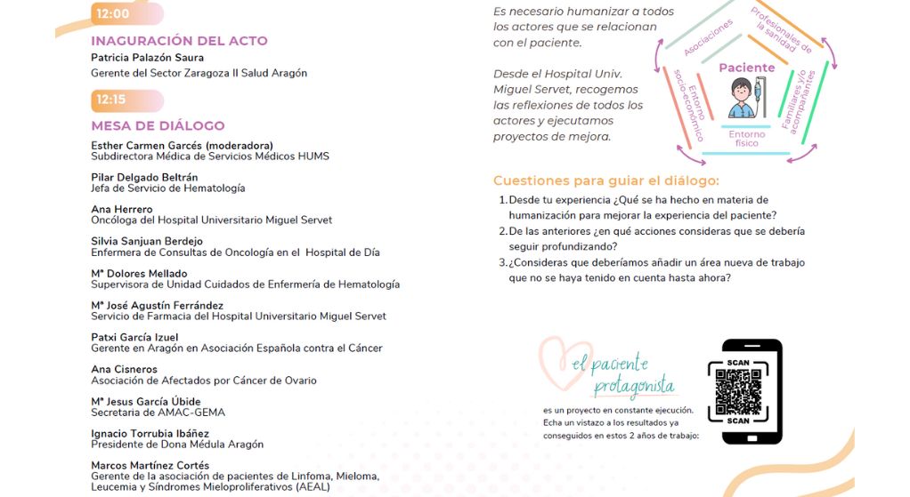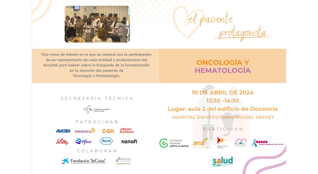 5 abril, 2024El próximo 10 de abril se llevará a cabo una mesa de diálogo en la que se contará con la participación de profesionales y un representante de cada asociación de pacientes para hablar sobre propuestas de mejora de la experiencia del paciente de Oncología y Hematología en el Hospital Universitario Miguel Servet. ¡Acércate y haz propuestas de mejora!