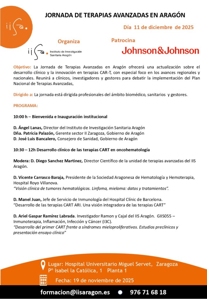 La Jornada de Terapias Avanzadas en Aragón tendrá lugar el próximo 11 de diciembre de 2025 en el Hospital Universitario Miguel Servet (Zaragoza), con el objetivo de analizar el desarrollo clínico, la innovación y los retos de implementación de las terapias CAR-T en el ámbito regional y nacional. La sesión está dirigida a profesionales biomédicos, sanitarios y gestores interesados en los últimos avances del Plan Nacional de Terapias Avanzadas.