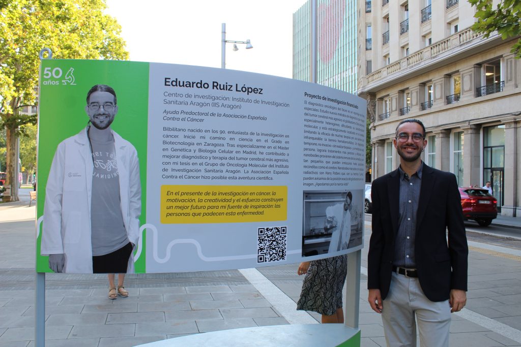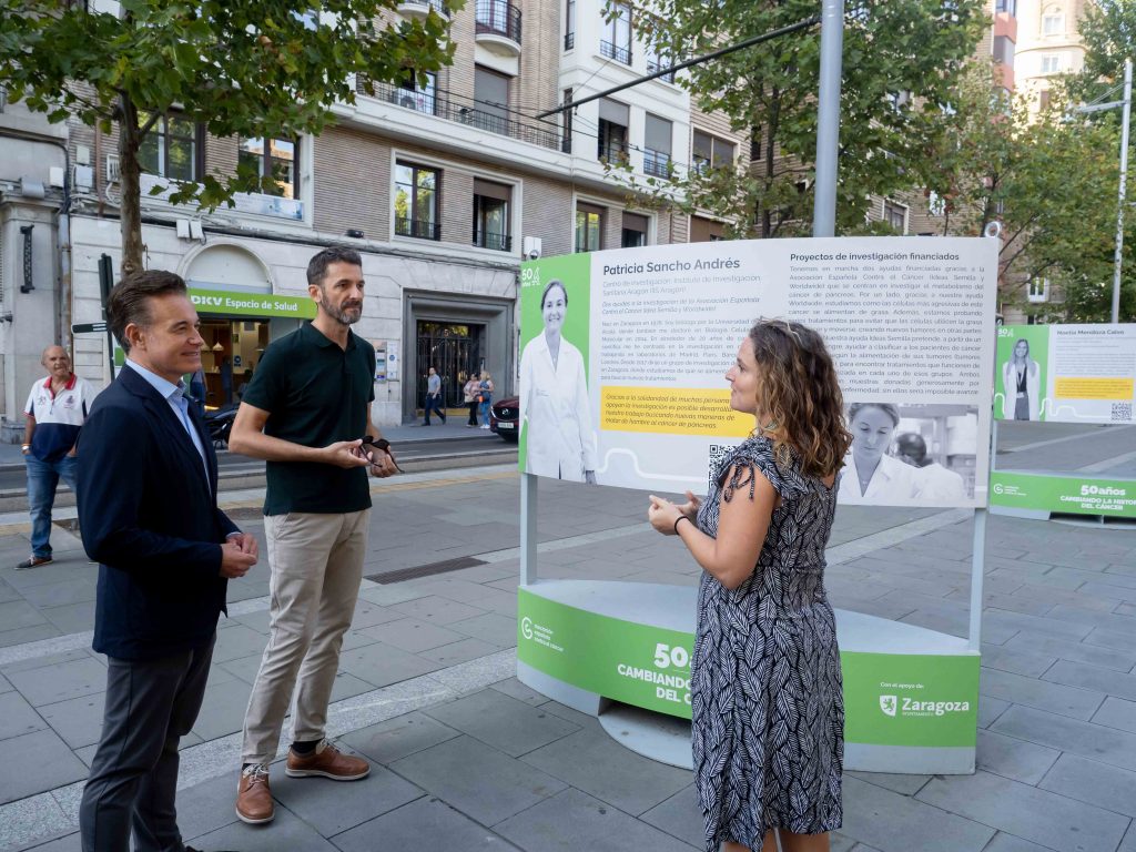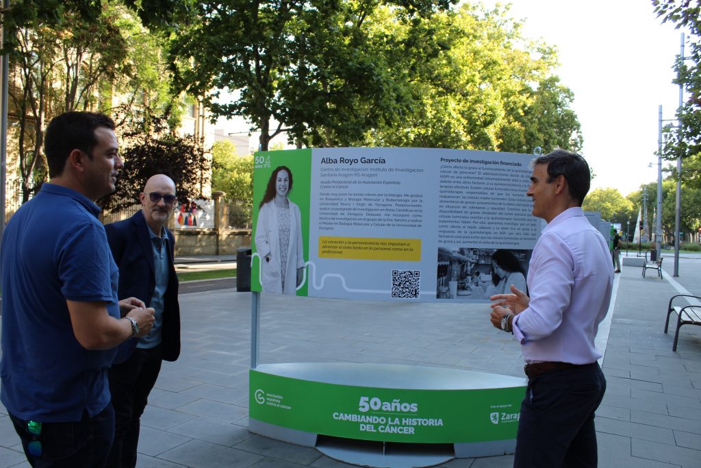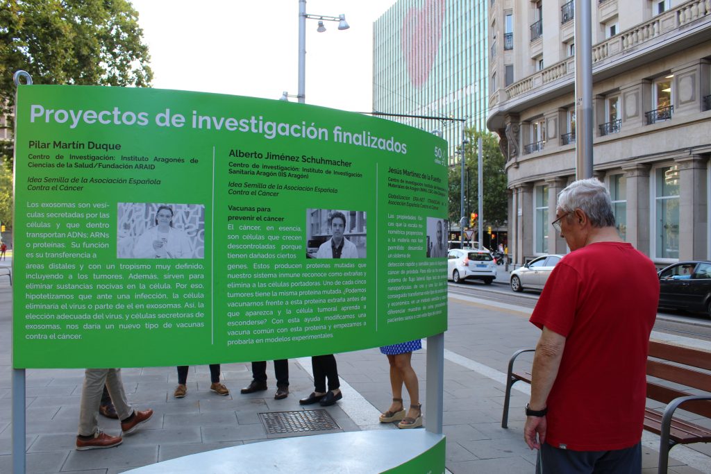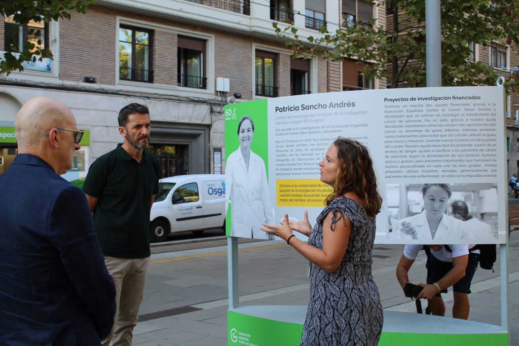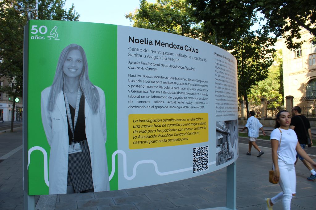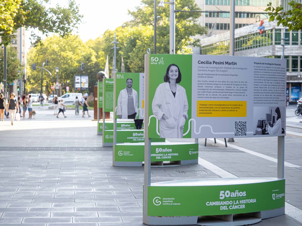 5 septiembre, 2022La Gran Vía de Zaragoza acoge hasta el próximo 30 de septiembre la exposición ‘Poniendo cara a la investigación’, una iniciativa de la Asociación Española contra el Cáncer (AECC) que busca visibilizar el trabajo de los investigadores y científicos para conseguir nuevos elementos de detección temprana de la enfermedad y tratamientos más eficaces. La exhibición muestra una breve descripción de los proyectos liderados por diez investigadores en la comunidad, seis de ellos del Instituto de Investigación Sanitaria Aragón (IIS Aragón), y los paneles cuentan con un código qr que ofrece un vídeo explicativo protagonizado por cada investigador.