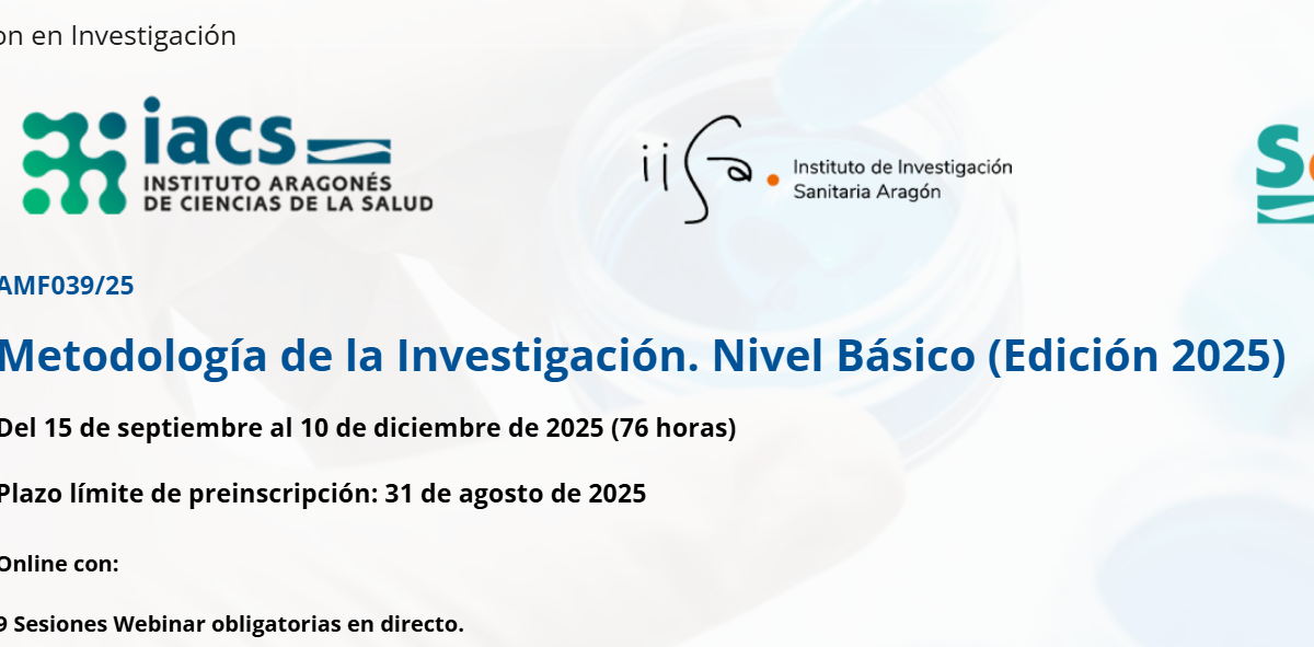Últimos días para apuntarse al ‘Curso: Metodología de la Investigación. Nivel Básico (Edición 2025)’, organizado por el Instituto Aragonés de Ciencias de la Salud (IACS), con la colaboración del IIS Aragín y el Servicio Araignés de Salud, que tendrá lugar del 15 de septiembre al 10 de diciembre de 2025 (76 horas) y que se celebrará en 9 Sesiones Webinar obligatorias en directo.