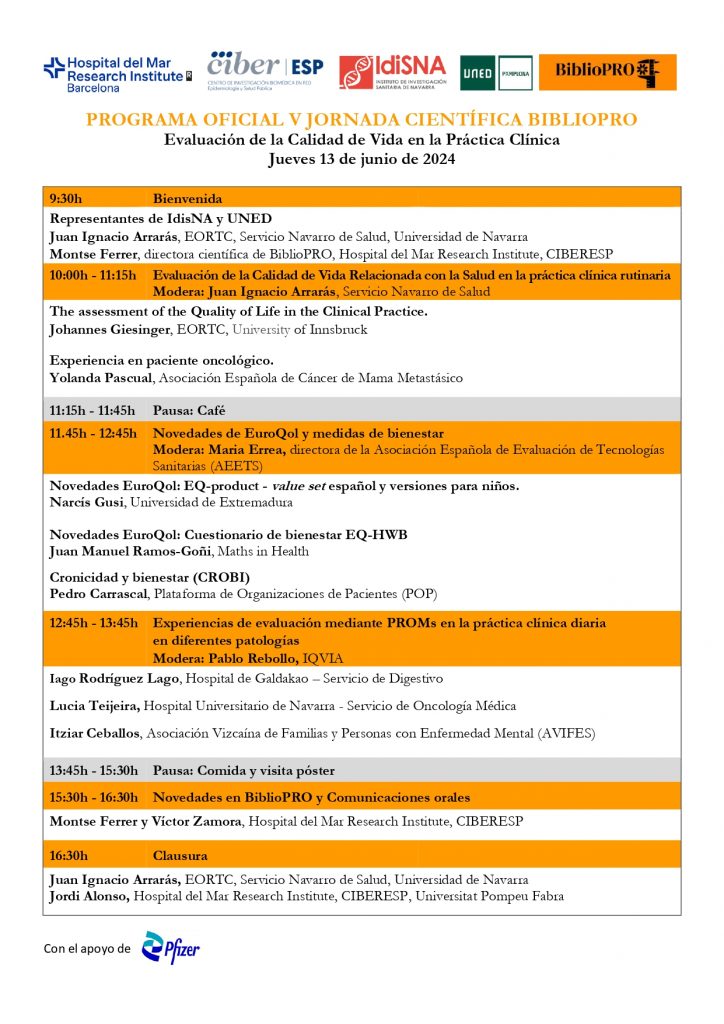 La V Jornada BiblioPRO, la biblioteca virtual de cuestionarios Patient-Reported Outcomes (PRO), tiene como lema “Evaluación de la Calidad de Vida en la práctica clínica” y tendrá lugar el 13 de junio de 2024 en la Universidad Nacional de Educación a Distancia (Pamplona). También se podrá seguir por streaming (gratuito, con inscripción).