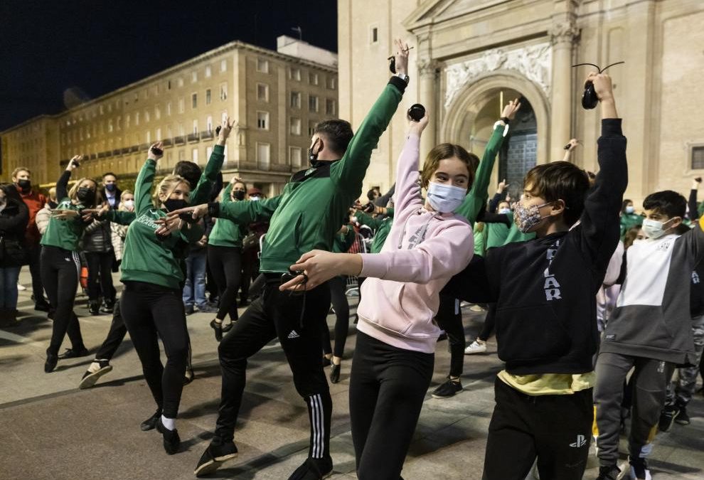 Desde 3 o 4 años hasta 75, o más, castañuelas en mano, y dispuestos a darlo todo bailando ‘El bolero de Zaragoza’ que llevan ensayando varios meses. Cuando la causa merece la pena, visibilizar el cáncer infantil con motivo de su día internacional, no hay edad que sea una excusa. "Hemos venido 110 y estamos encantados. Desde que nos avisaron en diciembre lo estamos preparando y los más pequeños, sobre todo, están encantados", decía Juan Carlos Aguayo, director de la escuela Baluarte Aragonés en la plaza del Pilar minutos antes de las 19.00, hora de inicio. La iniciativa solidaria regresa tras no poder celebrarse el año pasado por la pandemia y alcanza así su quinta edición.
