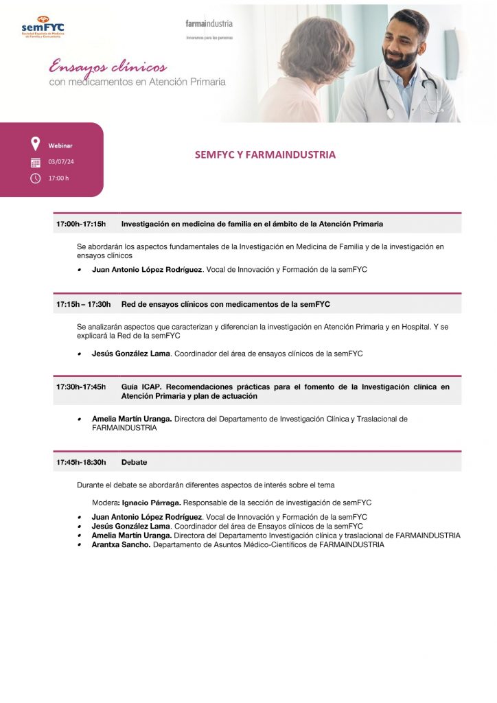 El webinar se celebrará el próximo miércoles 3 de julio de 17:00 a 18:30 de manera online. Para poder participar en las jornadas, los asistentes deben inscribirse a partir del siguiente enlace: https://www.farmaindustria.org/sites/servicios/webinarsemfycfi2024.html